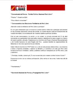 Comunicado de Prensa – Partido Político Nacional Perú LibreFecha: 19 abril de 2024Para difusión inmediata** Convocatoria a las Elecciones Partidarias