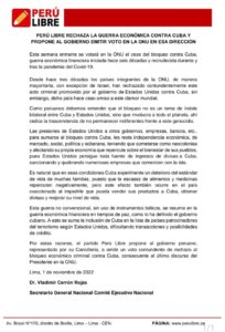 PERÚ LIBRE RECHAZA GUERRA ECONÓMICA CONTRA CUBA Y PROPONE AL GOBIERNO EMITIR VOTO EN LA ONU EN ESA DIRECCIÓN Esta